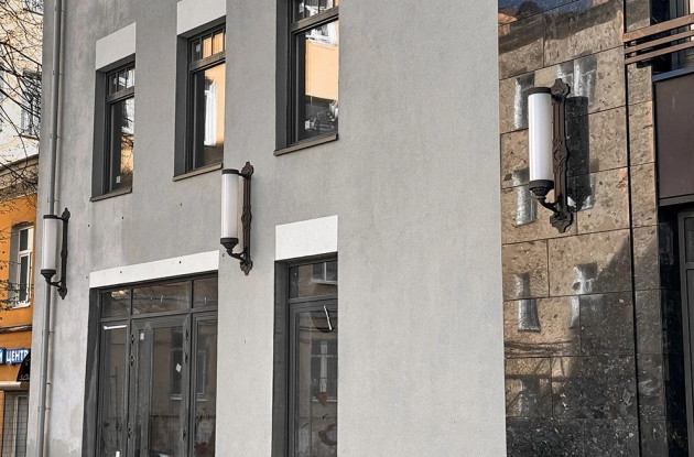 Фасад объекта выполнен в «стиле» фрагментизм: он искусственно разделен на три будто бы разных дома.