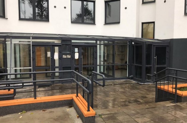 Балконные двери и окна остеклены тройными энергосберегающими стеклопакетами, выполнено сплошное остекление лоджий и балконов. Входные двери в здании изготовлены из алюминия и остеклены армированными стеклами.