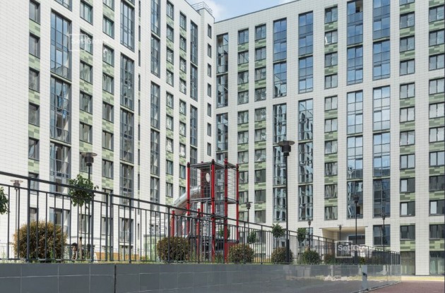 В жилом комплексе — четыре 12-этажных дома. Они спроектированы архитектурной студией «Интерколумниум» в современном стиле: навесные вентилируемые фасады украшены плиткой из керамогранита контрастных цветов, от молочного и графитового до разных оттенков зеленого.