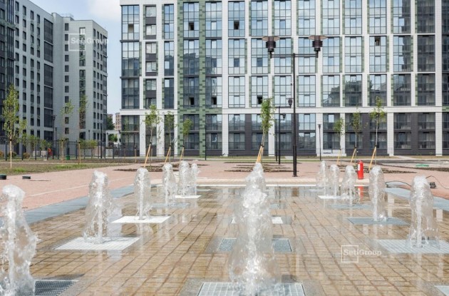 Отдельную часть двора занимает красивая зона отдыха — центр притяжения всего проекта. Здесь готов пешеходный фонтан, устроенный на уровне земли, между струями которого можно прогуливаться. Возле установлены скамейки, а окаймляют территорию для отдыха разнообразные деревья и кустарники.