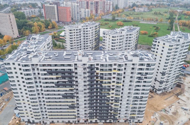 четыре 16-этажных кирпично-монолитных дома с фасадами из керамогранита;