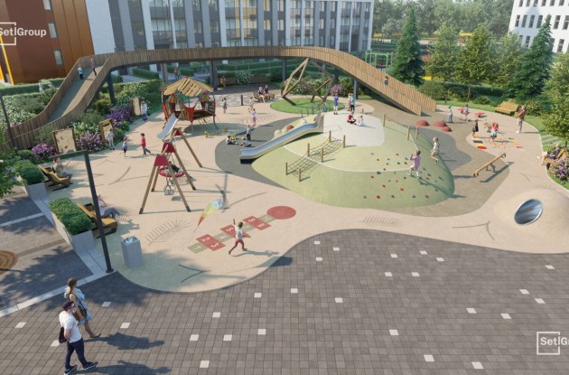 В корпусе 1 девелопер анонсировал входную центральную группу с зоной ресепшн и дизайнерской отделкой. Особенностью комплекса станет лаундж-зона на крыше. Там для жильцов установят мебель и перголу с качелями. Кроме этого в составе ЖК появится детский сад на 240 мест, школа с двумя бассейнами и стадионом на 550 учеников, детский клуб, ТЦ. Для автомобилистов под каждый корпусом предусмотрена подземная стоянка — всего будет оборудовано более 700 машино-мест, кроме этого появится многоуровневый наземный паркинг. В закрытых от машин дворах построят детские площадки, сделают зоны для отдыха. В центре жилого комплекса будет создано креативное пространство с видовой площадкой в виде моста и липовой аллеей. Также там оборудуют игровой парк SetlKids и спортивную зону SetlSport с тренажерами и площадками для баскетбола и волейбола.