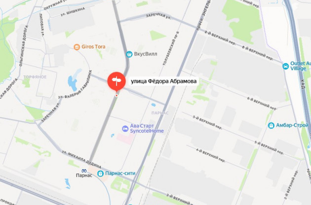 По проекту улица Федора Абрамова идет от улицы Михаила Дудина до улицы Шишкина. Фактически упирается в Заречную улицу. Все дороги в новом жилом микрорайоне Парнас (ЖК "Северная долина"), строит ООО «Главстрой-СПб специализированный застройщик», а затем возмещает потраченные деньги из городского бюджета.