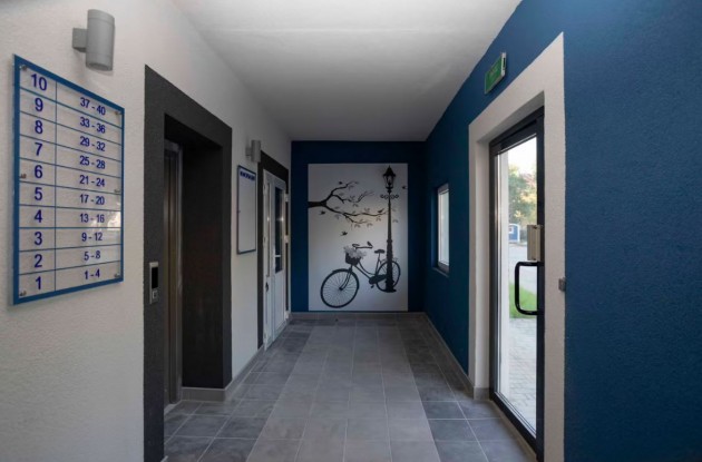 Входы в подъезды устроены с уровня земли, без ступенек и пандусов. Входы в подвальные помещения изолированы от жилой части. Каждая секция оснащена двумя лифтами – пассажирским и грузопассажирским. На входах в подъезды установлены утепленные металлические двери. Фасады отделаны декоративной штукатуркой по слою утепления.