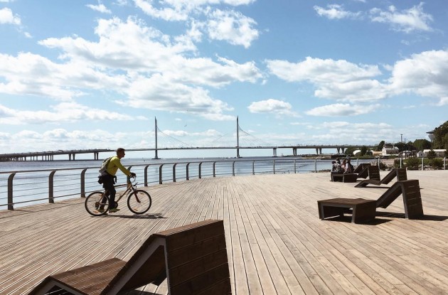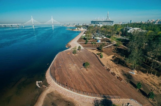 На Крестовском острове появилась зона от-дыха: участок у Южной дороги с выходом к Финскому заливу покрыли деревянным настилом, установили скамейки и столы для настольного тенниса, вокруг высадили деревья. Проект выполнен в европейском стиле, без типовых решений. На пляж у кромки воды завезен новый песок. Далее установили на 1200 сваях деревянный настил в 5000 м 2 , выполненный из лиственницы. Для долговечности доски обработаны масловоском, крепеж — скрытый, под площадкой. Концепция обустройства территории выполнена Комитетом по градостроительству и архитектуре с учетом сохранения природного ландшафта, в ней подчеркнуты и усилены природные акценты посредством геопластики, природных материалов, цветового решения и посадочного материала. Высажена целая аллея из елей, и проложены дорожки. На территории всей набережной установлено 119 светодиодных светильников и прожекторов. Освещена не только прогулочная зона, но и спортивные площадки. Обеспечена доступность для маломобильных групп населения: непрерывным освещенным, пешеходным транзитом вдоль всей береговой линии в твердом покрытии, возможностью подхода к пляжу, отсутствием перепада высот на всем протяжении маршрута, удобным оснащением зон отдыха, наличием специализированного оборудования спортивной и детской площадок, доступными стационарными туалетами. Спортивная зона также подходит всем возрастам и группам населения.