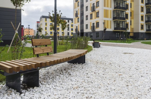 Во дворах между корпусами созданы общественные пространства для отдыха, общения и игр жителей разного возраста. Здесь есть детские площадки, которые органично включены в ландшафтный рельеф за счет геопластики, холмов, клумб и цветников. Зона с уличными тренажерами и большая елка, вокруг которой установлены скамейки, лавочки и столы, где можно играть в настольные игры. Каждый сможет найти себе место во дворе и с интересом провести время.