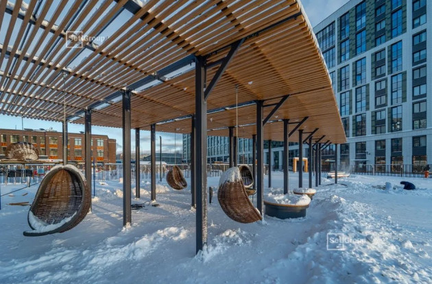 Просторные и безопасные дворы благоустроены и озеленены: вдоль дорожек высажены различные кустарники и взрослые деревья. Для отдыха обустроены площадки с подвесными качелями, скамейками и гамаками. Для детей организованы игровые площадки SetlKids с оригинальными горками, песочницами, бизибордами, качелями-гнездами и каруселями. Кроме того, во дворах установлены велопарковки с навесами. А на специально выделенной территории возле первого корпуса обустроена фитнес-станция SetlSport c различными турниками и баскетбольным кольцом.