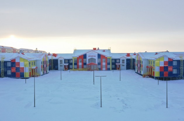 Двухэтажное П-образное здание детского сада (4104,5 м2) построено в непростых климатических и геологических условиях. На архипелаге специфические грунты, вечная мерзлота. Земля здесь постоянно промерзает и оттаивает, есть опасность эрозии и оползней, что может влиять на устойчивость зданий. Поэтому, прежде чем приступить к работам, специалисты выбрали имеющийся грунт, заменив его на песок, щебень и гравий. И только потом, в эту подушку, установили 9-метровые сваи.