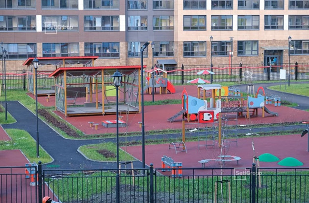 Двор детского сада застройщик озеленил и благоустроил. Игровые зоны – отдельные для каждой возрастной группы – оборудованы качелями, горками, игровыми комплексами и оснащены навесами от солнца и осадков. Для занятий физкультурой и активных игр на свежем воздухе Setl Group обустроил две большие спортивные площадки.