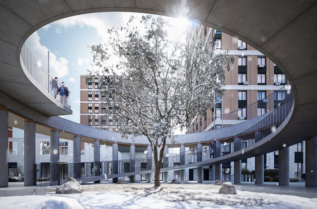 Общедоступная часть территории «Струн» – это парк с пешеходным бульваром, ресторанами и кафе, открытый для всем горожан. Приватная территория – это закрытые дворы, поднятые на стилобат высотой 6 метров и предназначенные только для жителей дома. Одна из ключевых деталей благоустройства: между приватными дворами двух очередей будет перекинут пешеходный мест, под которым будет проходить бульвар. При этом площадь одной только приватной части составит 11 000 кв. метров, площадь общественного парка – еще 13 000 кв. метров.