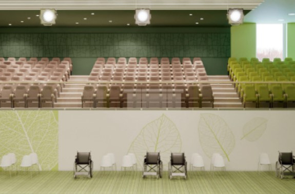 - Конференц-зал. Конференц-зал расположен на третьем этаже главного корпуса, общая площадь 290 кв.м. Вместительность - 287 посадочных мест. В конференц-зале предусмотрены места для размещения маломобильных групп пациентов.