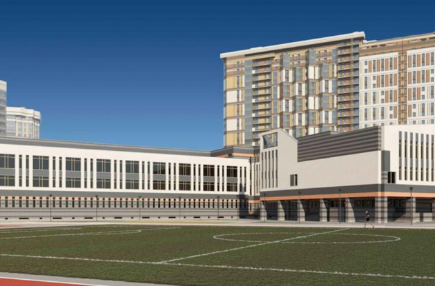 На заднем дворе школы будет организован стадион с футбольным полем, площадками для волейбола и баскетбола, а также места для отдыха учащихся. Перед входом в здание расположится площадь для массовых мероприятий.