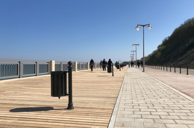 На променаде для удобства отдыхающих уже установлены деревянные скамейки, информационные стенды, велопарковки. Настроено освещение с помощью светодиодных фонарей. Обустроен и обновлены лестничные спуски в прогулочную зону. Финальным аккордом в благоустройстве стало озеленение газонов.