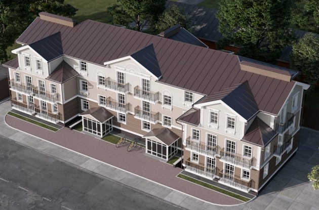 трехэтажное (первый, второй и мансардный этажи) кирпичное здание с