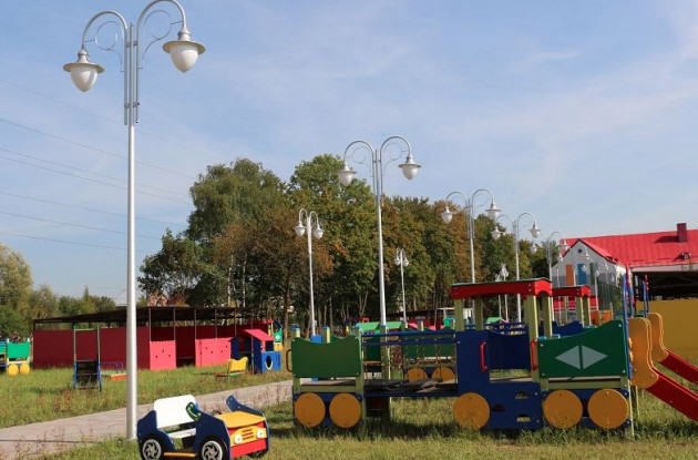 На территории обустроены 14 групповых детских площадок и теневых навесов, универсальная площадка для занятий волейболом-минифутболом, баскетболом, универсальная площадка для дошколят. Рядом с новым зданием создана учебно-опытная площадка для школьников, на которой они могут заниматься выращиванием различных сельскохозяйственных культур. Для создания благоприятных условий для детей и работающих в здании детского сада-школы сотрудников проектом предусмотрены озеленение территории, устройство площадок для отдыха со скамейками и урнами для мусора.