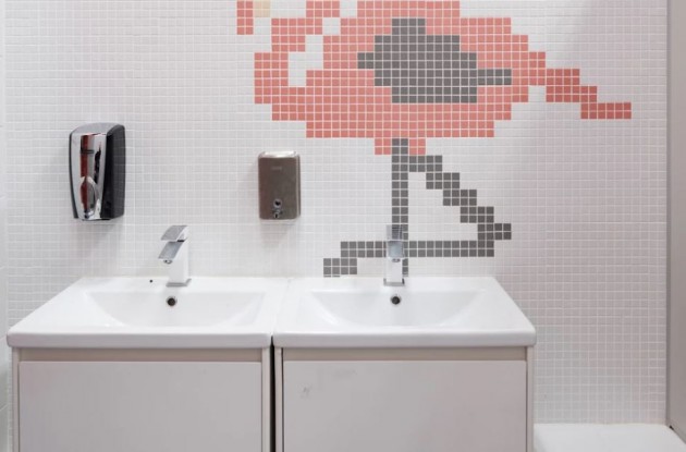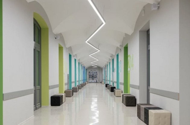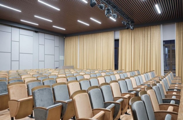 До капитального ремонта было: масляная краска коммунальных цветов, паркет елочкой, навесной потолок из пластиковых панелей, щербатый кафель. Стало: дорогостоящие мониторы в классах, реечный потолок в актовом зале, конференц-зал, как в приличном бизнес-центре, мозаика в туалетах.