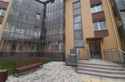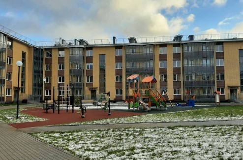 Во дворе установлены игровая и спортивная площадки. Проложены пешеходные дорожки, вымощенные плиткой. Предусмотрен открытый паркинг на 82 машиноместа.