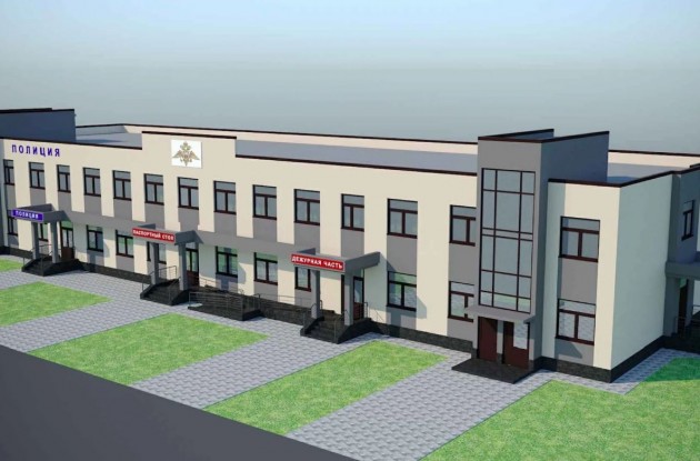 Проект здания полиции – типовой; оно рассчитано на 75 сотрудников, площадь – 2100 кв.м. Предусмотрены зал оперативного дежурного, служебные кабинеты, комната приёма граждан, помещения паспортной службы, гараж на пять машин.