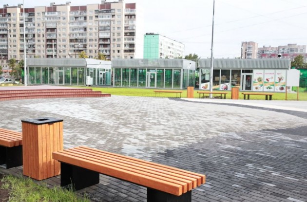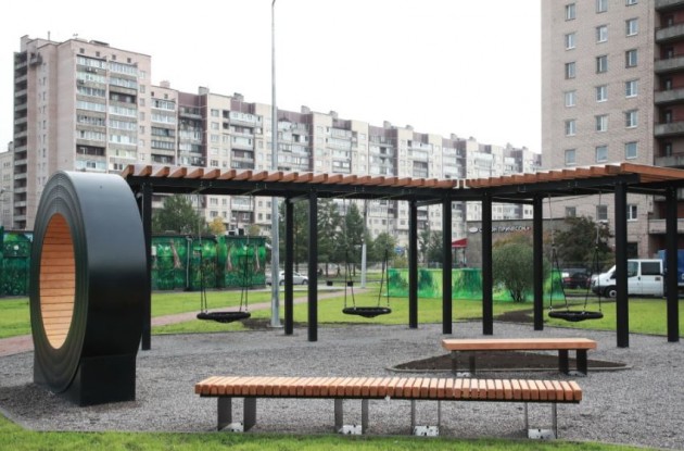 Заброшенный пустырь преобразился в уютный сквер в скандинавском стиле – теперь у жителей домов № 3 и № 9 на проспекте Большевиков в шаговой доступности появилось прекрасное место для прогулок и отдыха на свежем воздухе.
