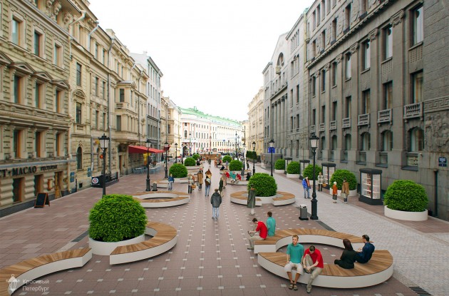 В рамках реализации проекта выполнено мощение Большой Морской улицы с логичным зонированием улицы за счет выделения функциональных зон: мелкая гранитная шашка в зоне примыкания к зданиям, гранитная скоба в зоне расположения входов в здание и террас кафе, узорное мощение в центральной части улицы. На границе транзитных тротуаров и центральной зоны расположены круглые гранитные скамьи, отмечающие углы «зон». Фонари оставили без изменения. В качестве нововведений на пересечении Невского проспекта и Большой Морской архитекторы предложили установить необычный парящий фонтан — невысокую, плоскую гранитную плиту, с которой плавно будет стекать вода. На фонтане инкрустировано изображение картушки морского компаса — дань памяти историческому названию улицы и ее первым жителям — сотрудникам адмиралтейства. На всем протяжении участка посажены кусты и деревья в кадках.