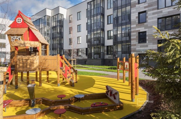 В игровых зонах благоустроены экологичные детские площадки с деревянным оборудованием. Созданы холмы из геопластики с тоннелями, игровые городки с горками-трубами, карусели, качели-гнезда, развивающие тренажеры и бизи-борды для малышей. Setl Group установил в одном из дворов игровой городок "Пиратский корабль" с горкой и веревочными лесенками.