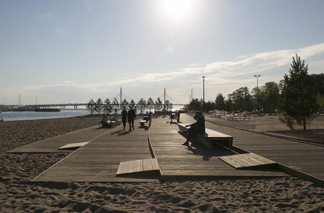На Крестовском острове появилась зона от-дыха: участок у Южной дороги с выходом к Финскому заливу покрыли деревянным настилом, установили скамейки и столы для настольного тенниса, вокруг высадили деревья. Проект выполнен в европейском стиле, без типовых решений. На пляж у кромки воды завезен новый песок. Далее установили на 1200 сваях деревянный настил в 5000 м 2 , выполненный из лиственницы. Для долговечности доски обработаны масловоском, крепеж — скрытый, под площадкой. Концепция обустройства территории выполнена Комитетом по градостроительству и архитектуре с учетом сохранения природного ландшафта, в ней подчеркнуты и усилены природные акценты посредством геопластики, природных материалов, цветового решения и посадочного материала. Высажена целая аллея из елей, и проложены дорожки. На территории всей набережной установлено 119 светодиодных светильников и прожекторов. Освещена не только прогулочная зона, но и спортивные площадки. Обеспечена доступность для маломобильных групп населения: непрерывным освещенным, пешеходным транзитом вдоль всей береговой линии в твердом покрытии, возможностью подхода к пляжу, отсутствием перепада высот на всем протяжении маршрута, удобным оснащением зон отдыха, наличием специализированного оборудования спортивной и детской площадок, доступными стационарными туалетами. Спортивная зона также подходит всем возрастам и группам населения.