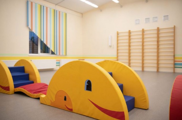 В здании разместились групповые помещения, музыкальный и спортивный залы, медицинский кабинет, процедурная комната и пищеблок.