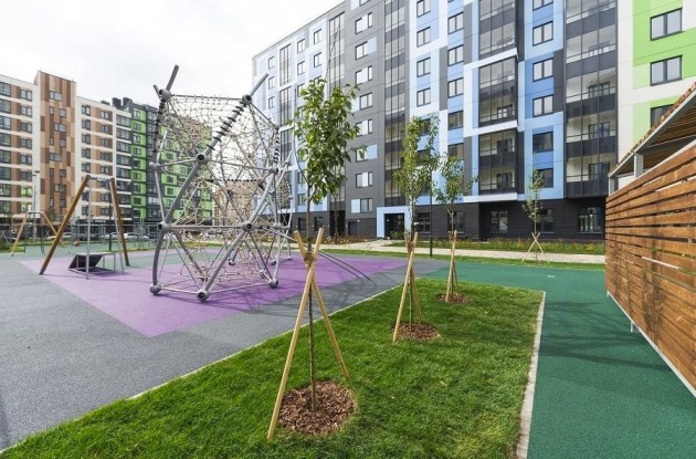 Во дворах между корпусами созданы общественные пространства для отдыха, общения и игр жителей разного возраста. Здесь есть детские площадки, которые органично включены в ландшафтный рельеф за счет геопластики, холмов, клумб и цветников. Зона с уличными тренажерами и большая елка, вокруг которой установлены скамейки, лавочки и столы, где можно играть в настольные игры. Каждый сможет найти себе место во дворе и с интересом провести время.