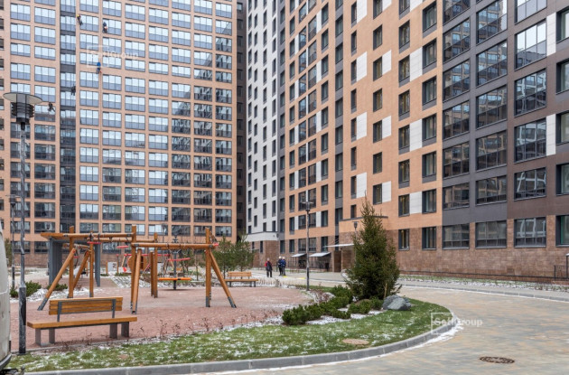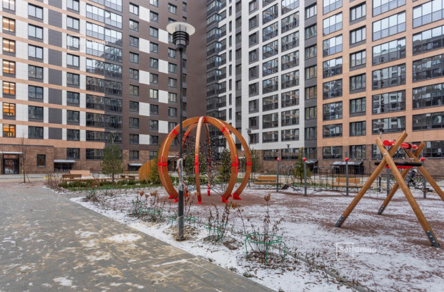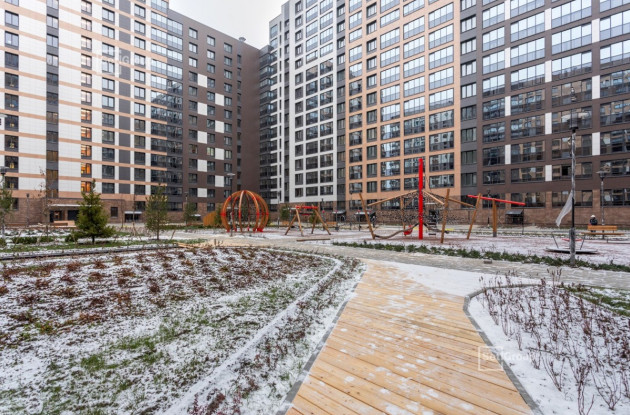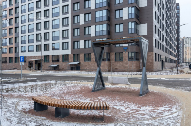 Двор первой очереди полностью благоустроен, здесь создана игровая площадка с качелями-гнездами, веревочными лабиринтами, игровым городком с горкой и трубой, а для малышей сделана необычная песочница-улитка. Также оборудована площадка для мини-футбола, волейбола и баскетбола. В зоне отдыха установлены деревянные лежаки, а в центре двора – качели под навесом. Разные территории связаны между собой прогулочными дорожками, вымощенными тротуарной плиткой.