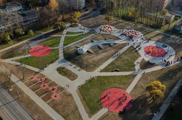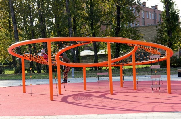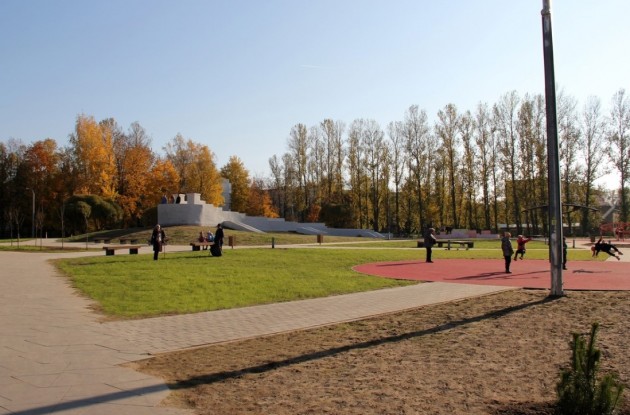 Здесь установлены качели, батуты, арт-объекты «Лабиринт», канатная дорога, благоустроены газоны, сделаны клумбы, высажены деревья. Появились новые пешеходные дорожки, светодиодное освещение и скамейки.