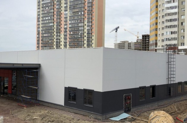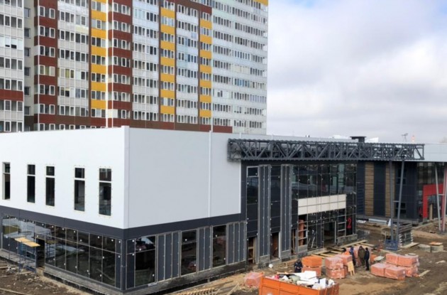 В Шушарах на углу Школьной улицы и Новгородского проспекта возвели первую очередь торгового городка. Это три здания из пяти.