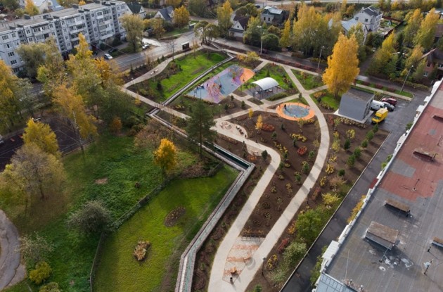 В сквере проложили пешеходные дорожки, через ручей перекинули мостики, а сам ручей оформили каменными габионами. Установленное наружное освещение стилистически соответствует архитектурному окружению участка. В сквере посадили деревья и кустарники.