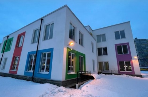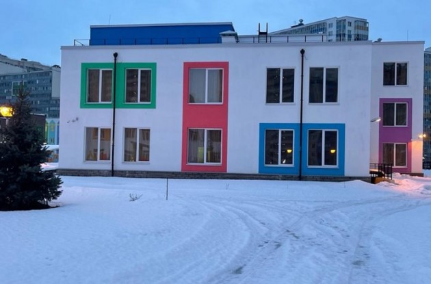 Детский сад площадью 3874,9 кв.м. рассчитан на восемь отдельных групп для детей от трех до семи лет. В составе каждой есть приемная и групповая зоны, спальня, буфет и игровая комната. Предусмотрены физкультурный и музыкальный залы, учебный класс, кружковое помещение, кабинет логопеда, пищевой и медицинский блоки, административные и служебно-бытовые помещения.