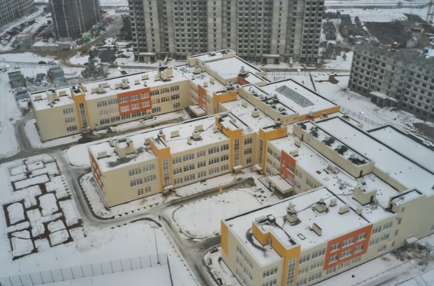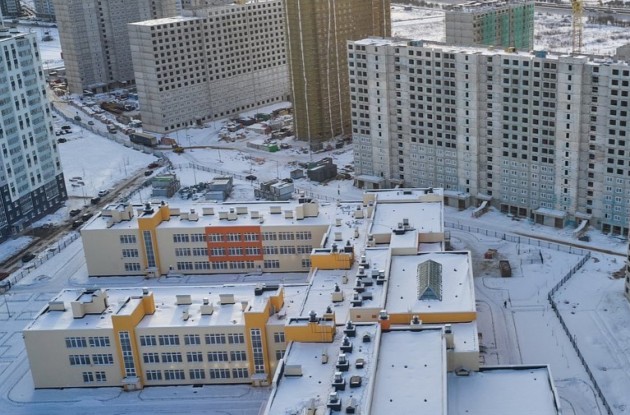 Школа состоит из пяти блоков, три из которых учебные. В четвертом находятся спортивный и актовый залы, библиотека, столовая и медкабинет, а в пятом – два бассейна. Вокруг учебного комплекса оформлены пространства для игр, общения и новых спортивных рекордов.