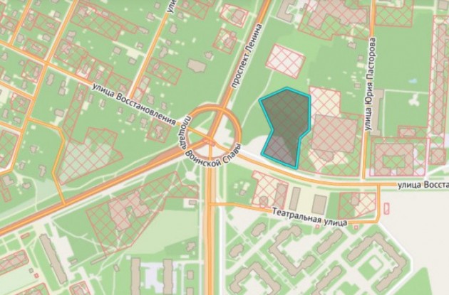 Участок размером 0,86 га (кадастровый номер: 78:40:0009043:9) находится на улице Восстановления, участок 1 (северо-восточнее пересечения с пр. Ленина) и практически примыкает к площади Воинской Славы.