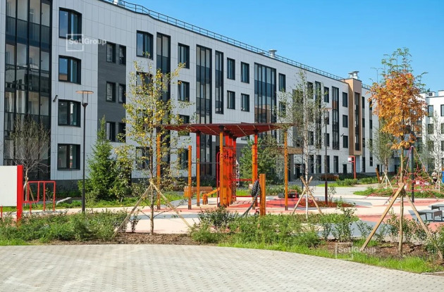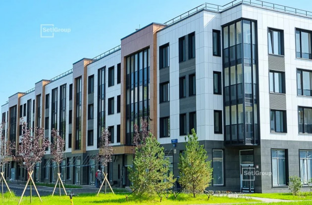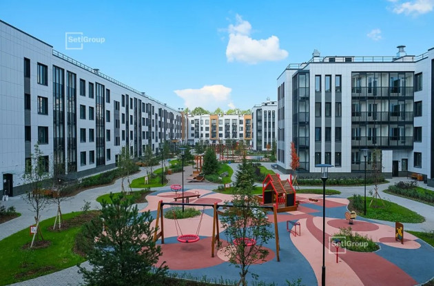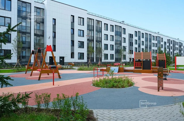 Просторный и безопасный двор нового корпуса благоустроен и озеленен: вдоль извилистых дорожек высажены кустарники – спирея, кизильник, ирга; взрослые деревья – сосна, береза, клён, рябина, а также луговые травы. Для отдыха обустроены площадки с подвесными качелями, скамейками, шезлонгами и гамаками. Для детей организованы игровые площадки SetlKids с оригинальными горками, песочницами, бизибордами и качелями-гнездами. Для занятий спортом обустроены площадки по стандарту SetlSport: фитнес-капсулы, тренажёры и различные турники.