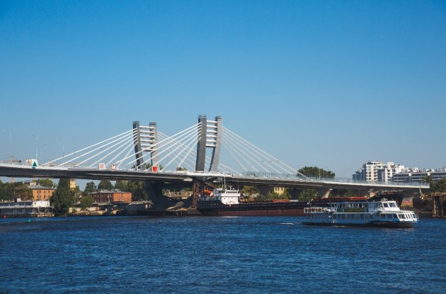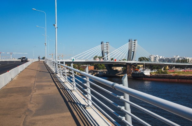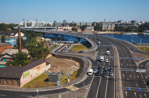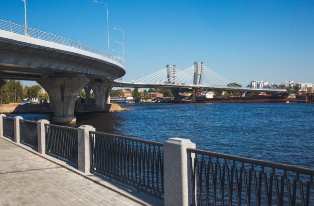 В границах мостового перехода располагаются две транспортные развязки в разных уровнях, обеспечивающие связь с проектируемой набережной Адмирала Макарова и существующим Петровским проспектом.
