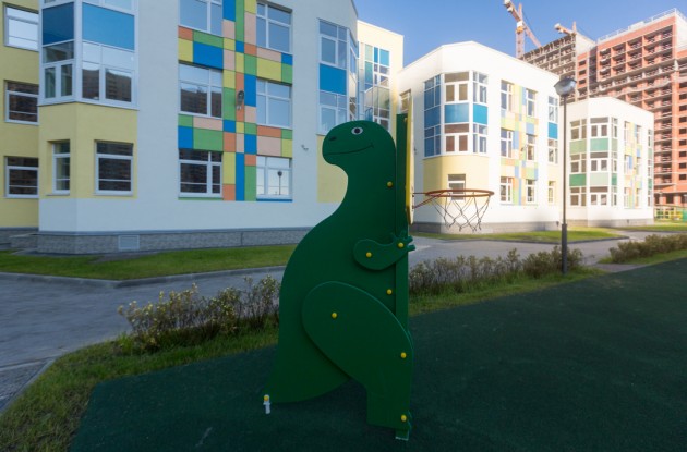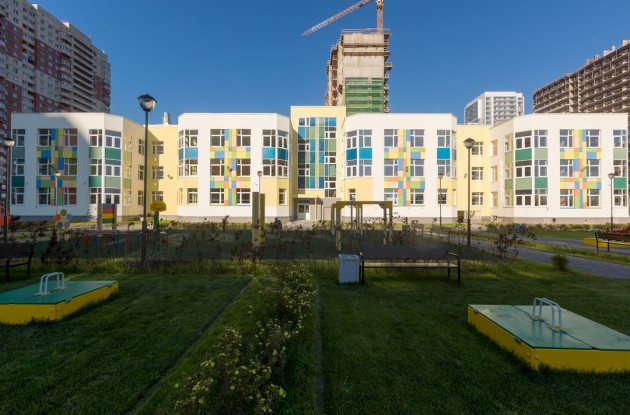 Детский сад построен по кирпично-монолитной технологии. Зданию присвоен класс энергоэффективности А++ (очень высокий). Пластика главного фасада формируется 3-этажными симметричными объемами групповых ячеек с повторяющимся ритмом оконных проемов, угловых витражей и декоративных цветных вставок с акцентом на главный вход с витражным остеклением. С другой стороны – объем здания понижается уступами.