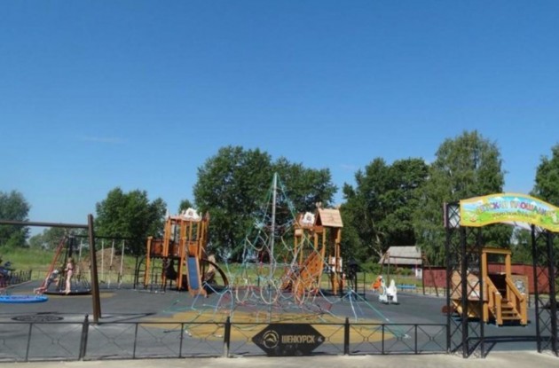 На площадке отдыха появились два игровых комплекса, качели маятниковые с подвесом «Гнездо», канатная карусель, информационный стенд, при входе на площадку установлена арка, по периметру детской площадки подрядчик установил металлическое ограждение, на ограждении с центрального входа установлены два щита, на которых сделана лазерная гравировка символики города – надпись «Шенкурск» и голова барсука.