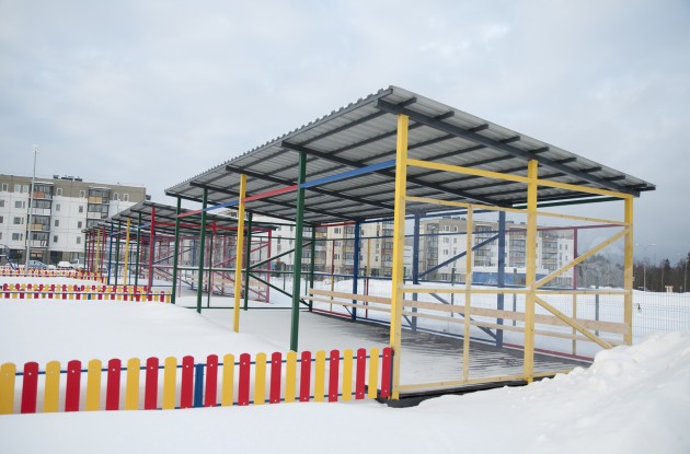 Территория вокруг детского сада полностью обустроена. Игровые площадки укомплектованы беседками с прозрачными стенками, различными горками, качелями, домиками, скамейками и т. д.