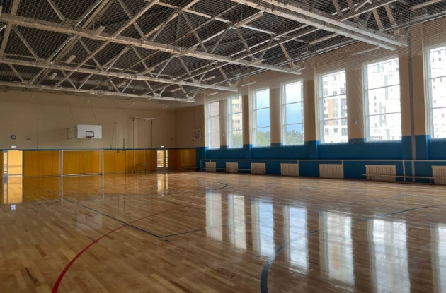 Рядом со школой обустроена спортивная зона: поле для игры в футбол, площадки для гимнастики и подвижных игр, беговые дорожки, яма для прыжков, теннисный корт, площадка для игры в волейбол и баскетбол, пространство для метания ядра и зоны отдыха.