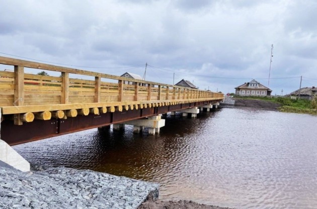 Работы на объекте велись с февраля 2022 года. За это время подрядная организация возвела комбинированный мост с железобетонными опорами и деревянным настилом.