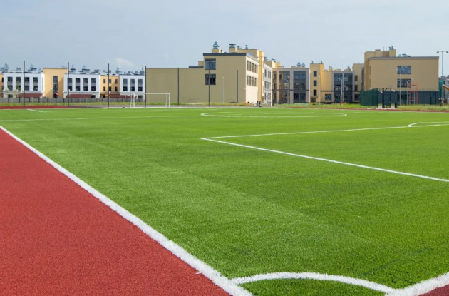 Во дворе застройщик благоустроил площадку для массовых мероприятий и места для отдыха. Рядом разместились футбольное поле, беговые дорожки, а также спортплощадки для волейбола и баскетбола. Территория школы озеленена: здесь высажены ели, клёны, липы, сирень – всего 75 деревьев и более 3 тыс. кустарников.