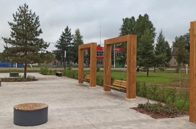 Территория разделена на две функциональные площадки. На первой — пространство для отдыха с городскими качелями, скамейками, клумбами, зеленью. На второй — детская площадка для активного отдыха с каруселями, качелями и паровозом, символизирующим значимость железной дороги для города. Территория освещена фонарями.