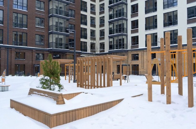 Проект 16 лота был разработан ООО «Архитектурная кампания». На территории дома выполнено качественное благоустройство: есть детские площадки и тренажёры для занятий спортом, обустроены зоны отдыха со столами и скамейками, выполненными из дерева, а на искусственно созданных холмах установлены скворечники, чтобы маленькие жители дома могли изучать птиц.