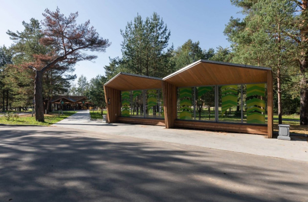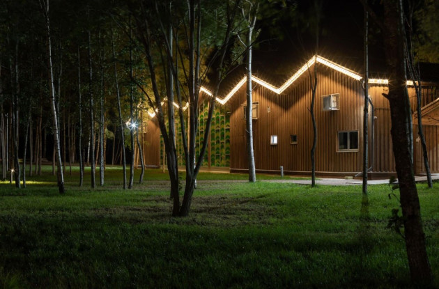 Тропинки из натурального дерева, «парк-лазалка», арт-объект «Солнце», который может быть использован как лабиринт или зона, где могут поползать самые маленькие гости, а также скамейки и шезлонги для отдыха.
