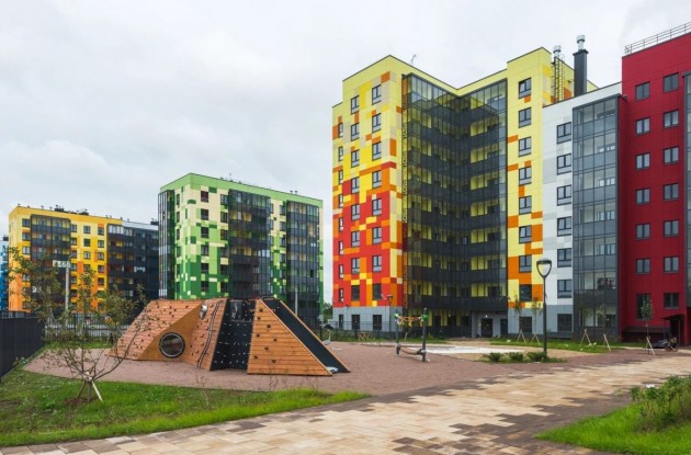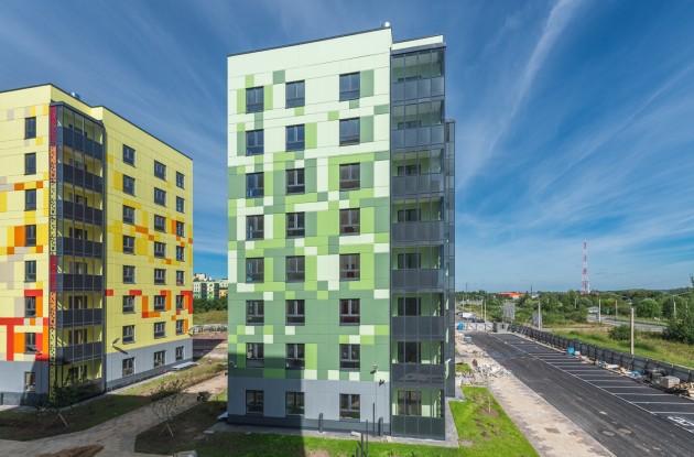 Сданные дома имеют переменную высотность, от 7 до 9 этажей. Фасады выполнены в соответствии с единым дизайн-кодом квартала, включающем до 37 оттенков, и оформлены в пиксельной технике. Такие же цветовые решения применены в интерьере парадных и мест общего пользования.