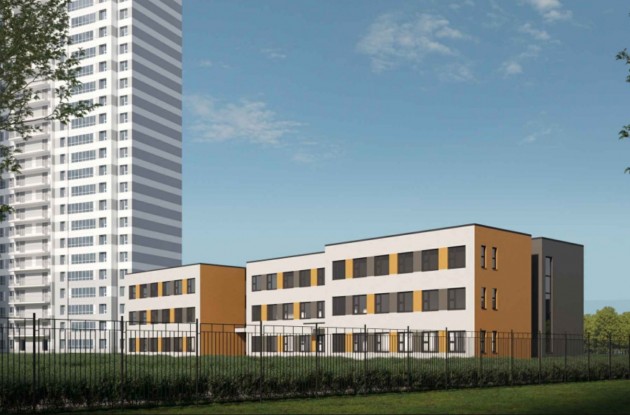 В трехэтажном здании детского сада проектной документацией предусмотрены бассейн, физкультурный и музыкальный залы, кружковые помещения. Для детей раннего возраста запроектированы отдельные выходы на игровые площадки.