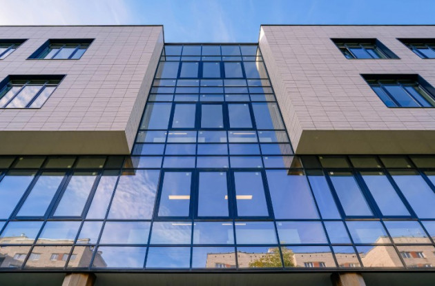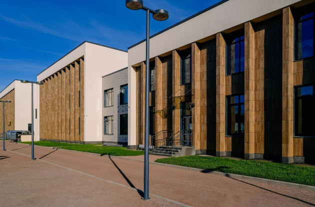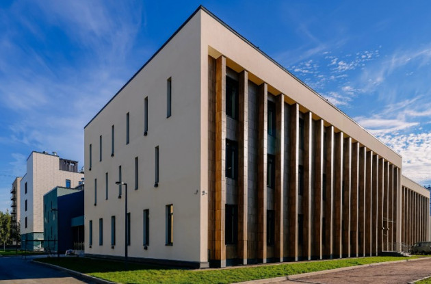 Здание вписано в архитектуру жилого квартала «Наука», вентилируемый фасад школы выполнен из керамогранитной плитки светлых оттенков и в цвет дерева, и фасадной штукатурки. Прилегающая территория будет благоустроена и озеленена.