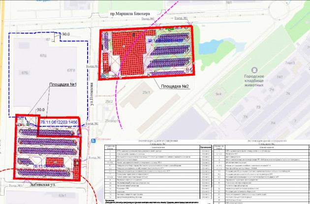 Объект будет состоять из двух площадок. Площадка №1 располагается на двух земельных участках общей площадью 48,6 тыс. кв. м: участок 2 на Анисимовской дороге (квартал 22А, нежилая зона "Ржевка") и участок 113 на Индустриальном проспекте. Площадка №2 располагается на земельном участке площадью 53,5 тыс. кв. м: участок 17 на ул. Потапова (севернее дома 7, корпус 5, литера А по улице Электропультовцев).